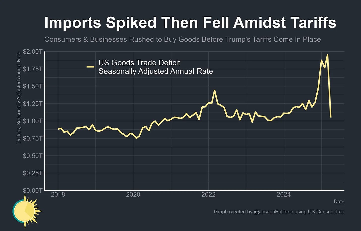 “I just don't think that can last forever,” Furman told me. As companies sell through their inventories and discover that they can’t destroy their profit margins indefinitely, higher prices “will soon show up in consumer prices,” he said. In fact, we can already see that imports spiked immediately after the tariffs were announced and have since plummeted back to baseline.