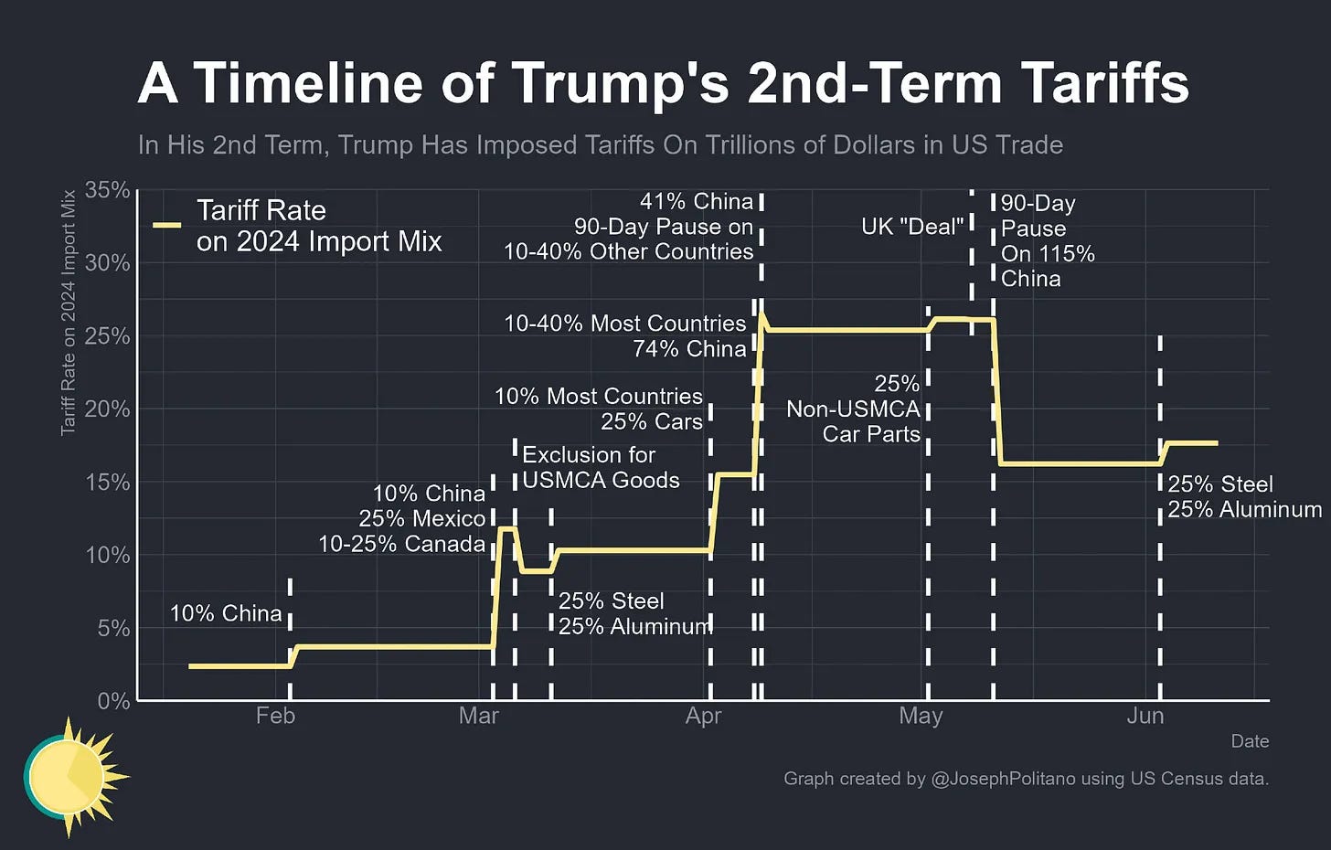 The excellent economic writer Joey Politano—whose graphs I’m using in this piece and whose Substack I recommend very highly—offers a nice visual representation of the constantly changing tariff regime. Genuinely, how do you evaluate the wisdom of any one tariff policy when they change this often?