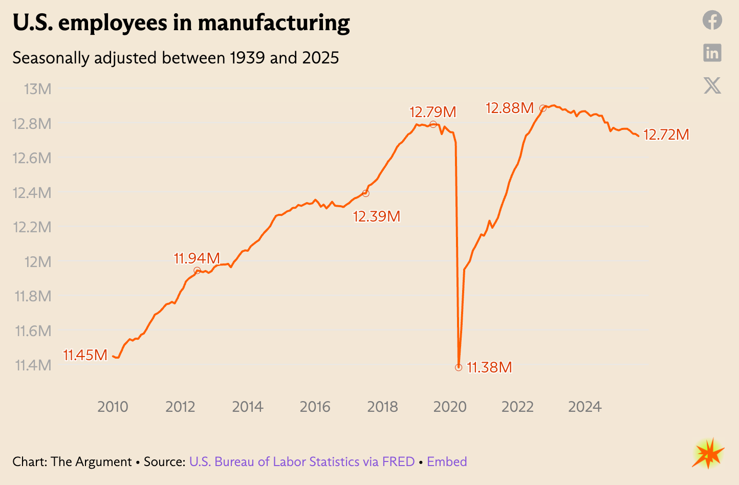 The industries most directly affected by Trump’s tariffs are doing poorly. Farmers are hurting, and some have been promised a bailout. The manufacturing industry is in a hiring recession, with employment falling steadily over the last six months.