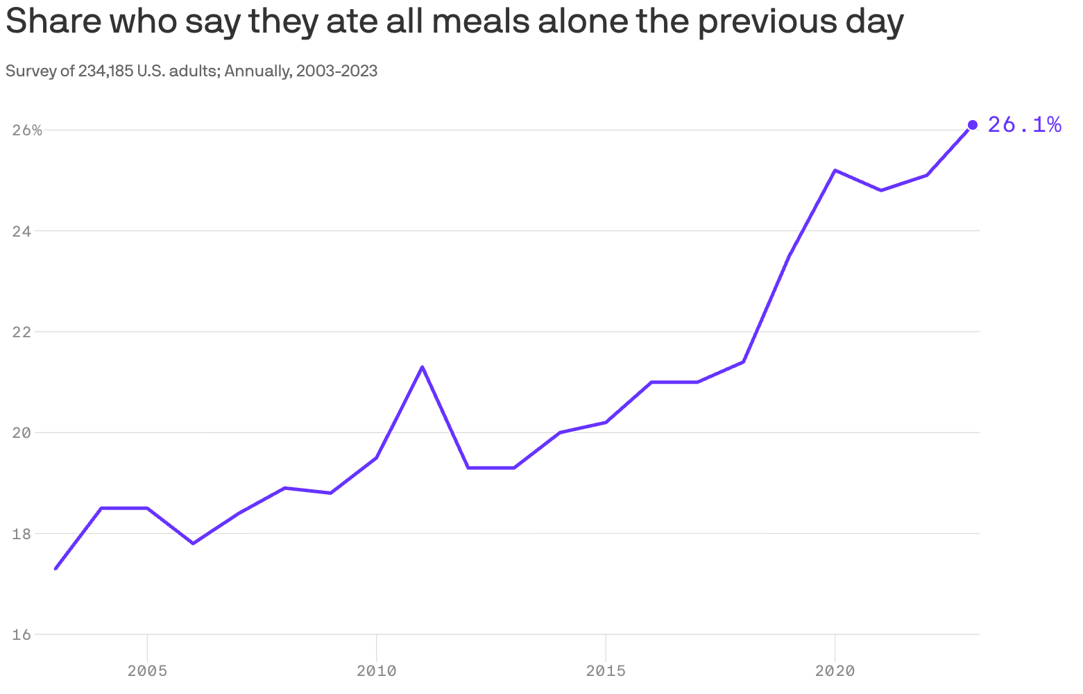 America’s fitness boom, for example, has also mostly come from an increase in solo workouts—particularly for young men. Every gender and age group is more likely to work out alone than they were at the beginning of the 21st century, according to an analysis by Luke Pardue, policy director at the Aspen Institute’s Economic Strategy Group. The share of men under 25 who say they exercise by themselves has increased 60 percent in the last two decades—more than any other group. Similarly, Americans eat out more than ever, but the share of Americans who say they have all their meals alone has increased 50 percent in the last 20 years.