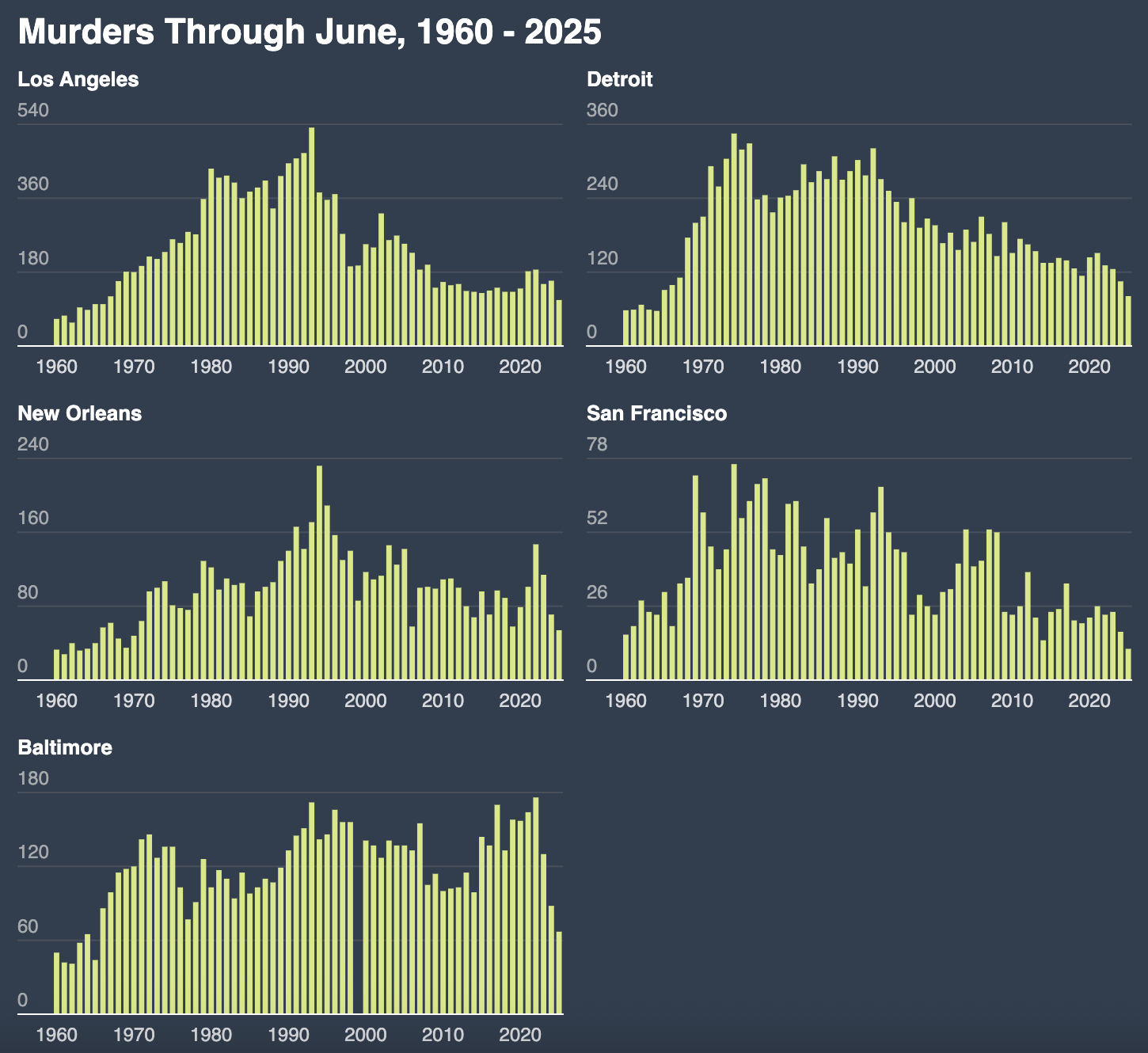 Murder rose at its fastest rate ever in 2020. In 2025, it seems to be falling at its fastest rate ever. While the fidelity of crime statistics is often debated, the crime analyst Jeff Asher has written that almost every major data source—including the FBI, the Real-Time Crime Index, and the CDC WONDER database—converges on the same finding: Crime is plummeting at historic rates, and in many cities, the number of murders is approaching record lows.
