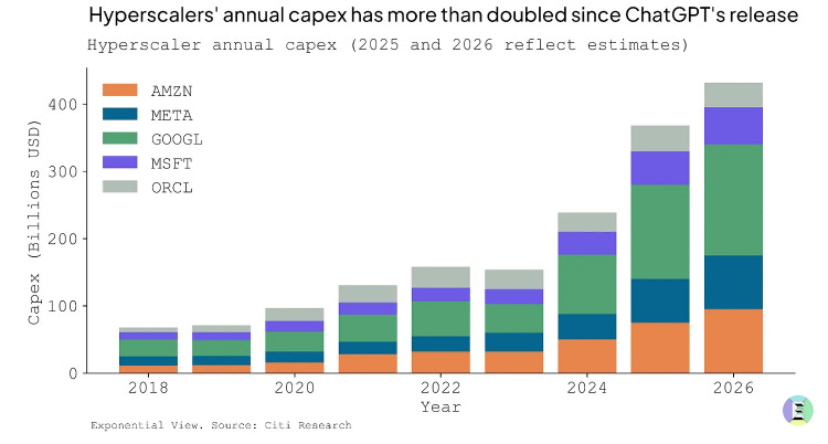 Every economic bubble also has tell-tale signs of financial over-engineering, like the collateralized debt obligations and subprime mortgage-backed securities that blew up during the mid-2000s housing bubble. Ominously, AI appears to be entering its own phase of financial wizardry. As the Economist has pointed out, the AI hyperscalers—that is, the largest spenders on AI—are using accounting tricks to depress their reported infrastructure spending, which has the effect of inflating their profits1. As the investor and author Paul Kedrosky told me on my podcast Plain English, the big AI firms are also shifting huge amounts of AI spending off their books into SPVs, or special purpose vehicles, that disguise the cost of the AI build-out.