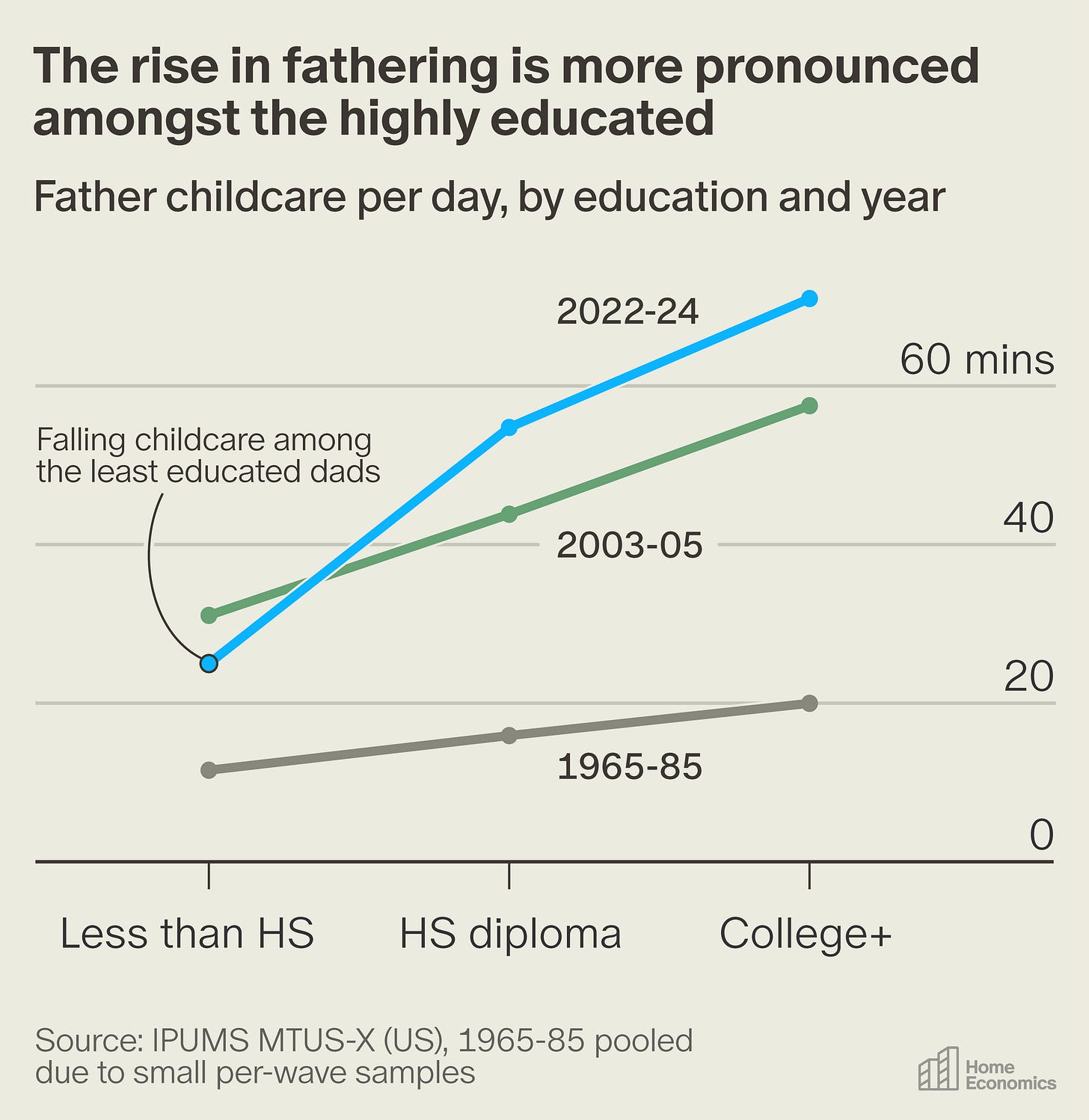 But let’s consider. In a 2008 paper, “Parental Education and Parental Time with Children,” Jonathan Guryan, Erik Hurst, and Melissa Kearney found that, in the U.S. and across the developed world, it has been the most educated parents who have most increased their time spent with children. Our own analysis shows that the increase in fathering time is significantly driven by changes among college-educated fathers under 45 years old. In the 1960s, fathers with a bachelor’s degree only spent about 9 additional minutes taking care of their kids, compared to dads without a high school degree. In the last 60 years, that education gap has quintupled to 46 minutes.