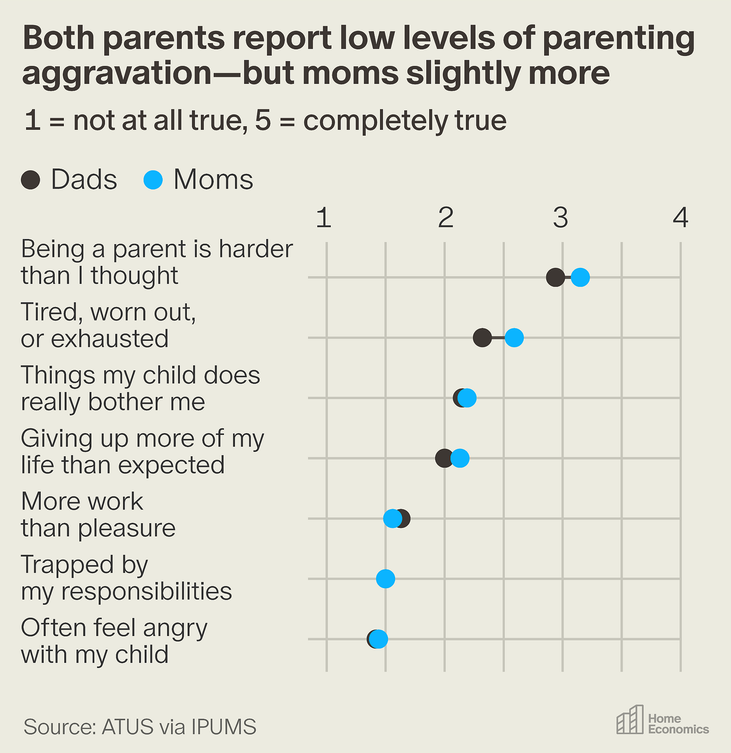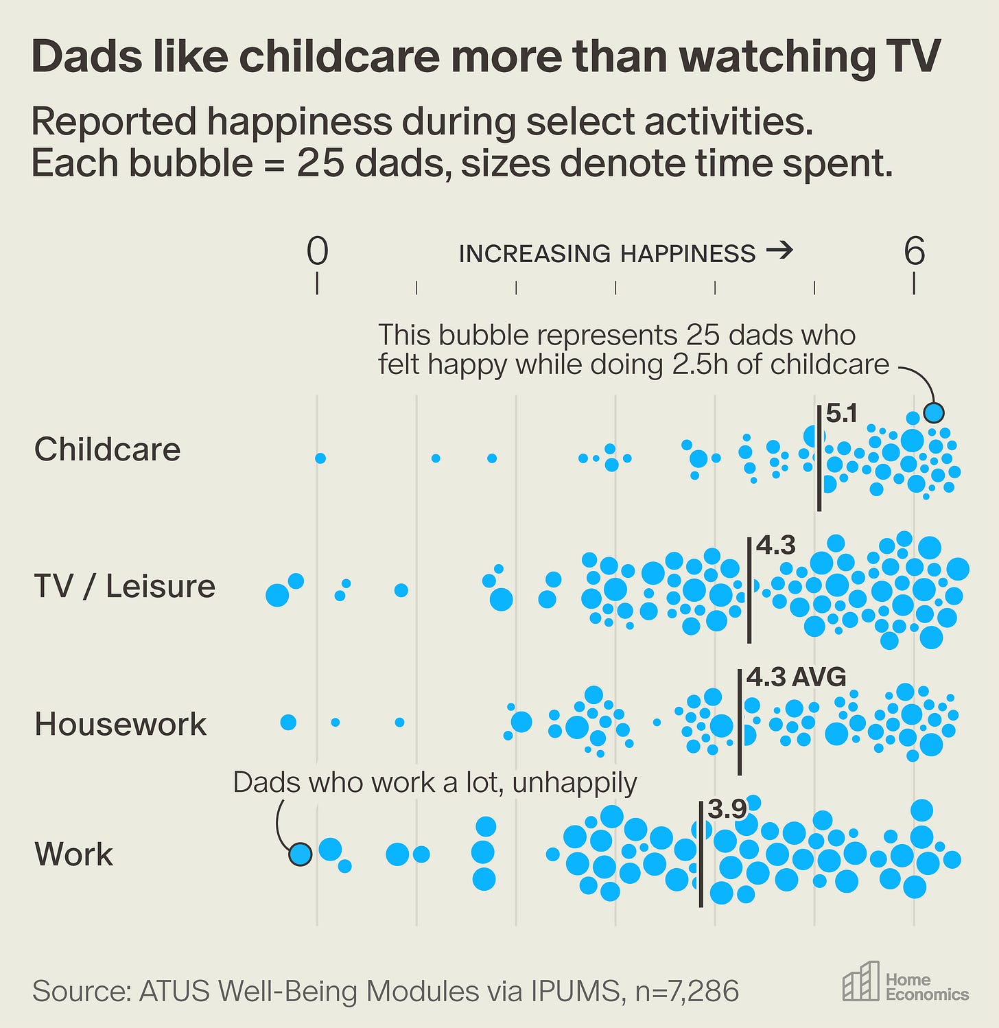 In fact, Guryan et al. found that “parents report that spending time with their children, especially in recreation or educational child care, is among their more enjoyable activities, especially when compared with other standard home production activities.” Our analysis of government data concurs. According to the American Time Use Survey well-being questionnaire, fathers say that little brings them more joy than being with their kids, other than hanging out with friends.