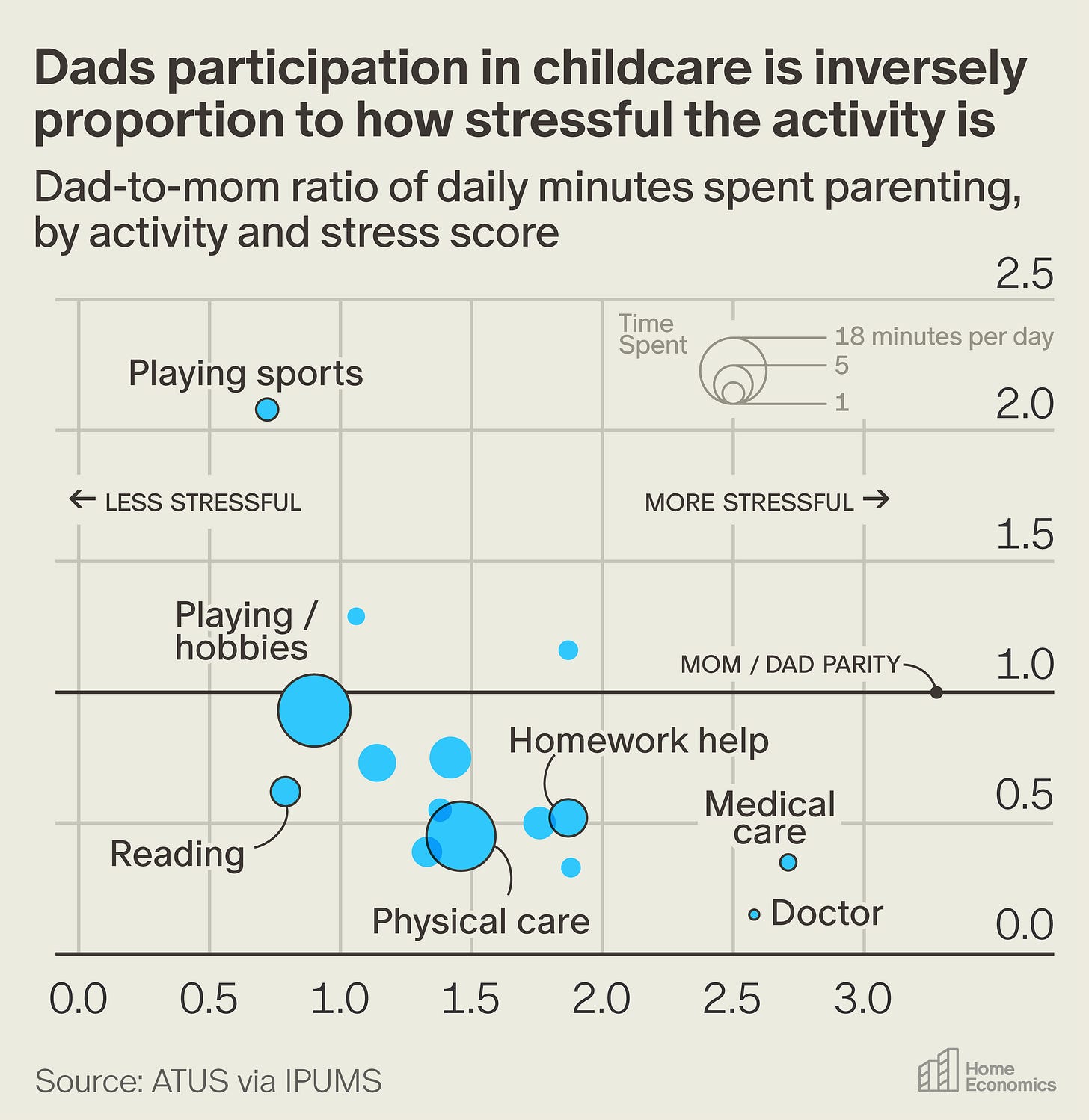 It’s not just that moms spend more time with kids. They also pick up the most stressful responsibilities. While fathers spend more time playing sports with their children, mothers spend more than twice as much time providing medical care, planning appointments, and taking care of the so-called mental load of parenting (i.e., not just driving your kid to the birthday party, but also remembering that classmate’s birthday party existed in the first place and buying a present ahead of time). In fact, the more stressful the childcare activity is, the more likely mothers are to do it.