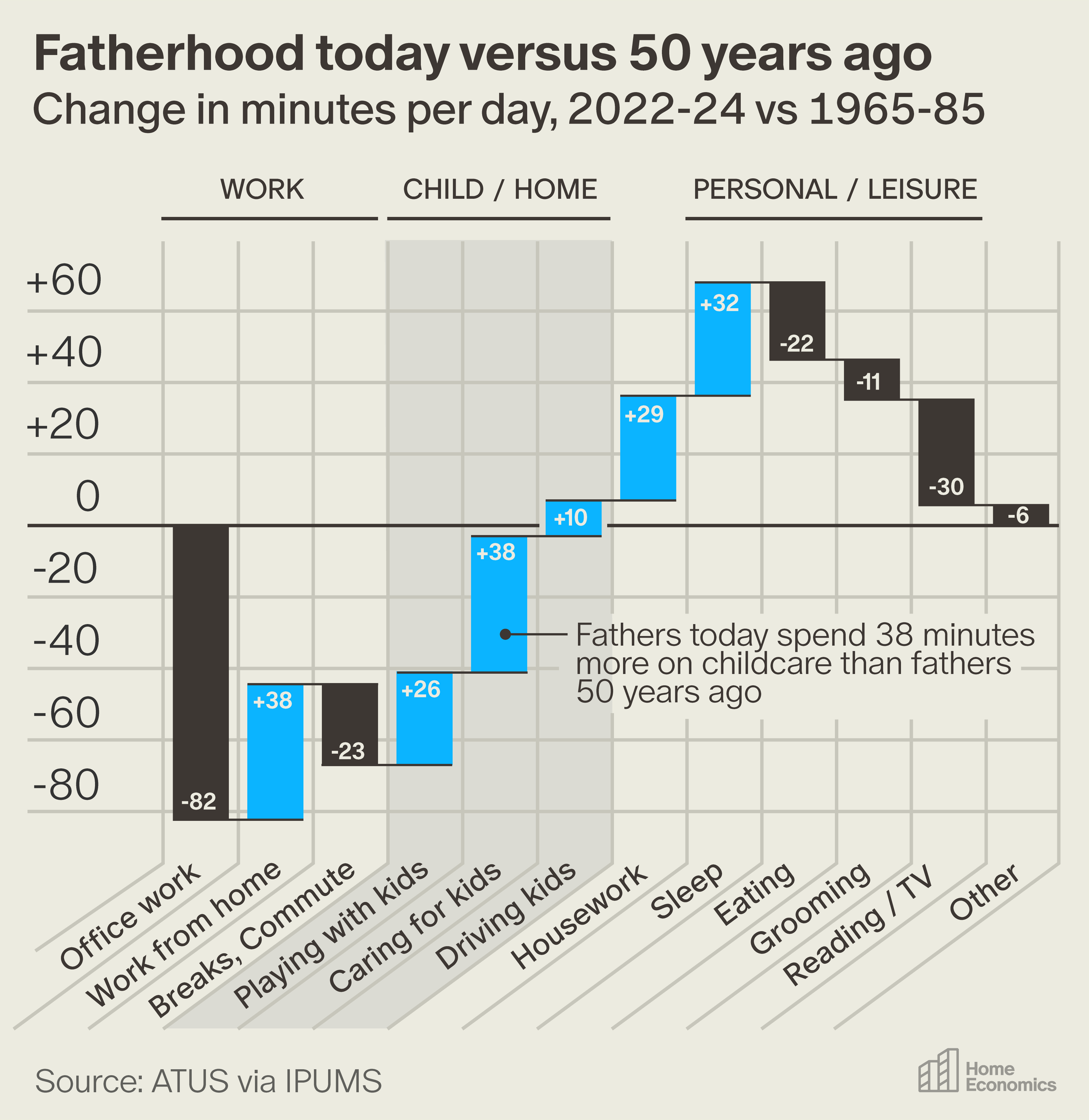 In 1965, the typical married father barely spent half an hour each day actively engaged in childcare, according to the best time-use data we have1. Today, Millennial thirty-something dads typically spend more than 80 daily minutes changing diapers, reading and playing with their children, driving them to soccer practice, and going over homework. To make time for kids, modern fathers have reduced their daily office work by more than an hour—not to mention, cut down their TV time by 30 minutes—as they pour more of their waking life into being at home.