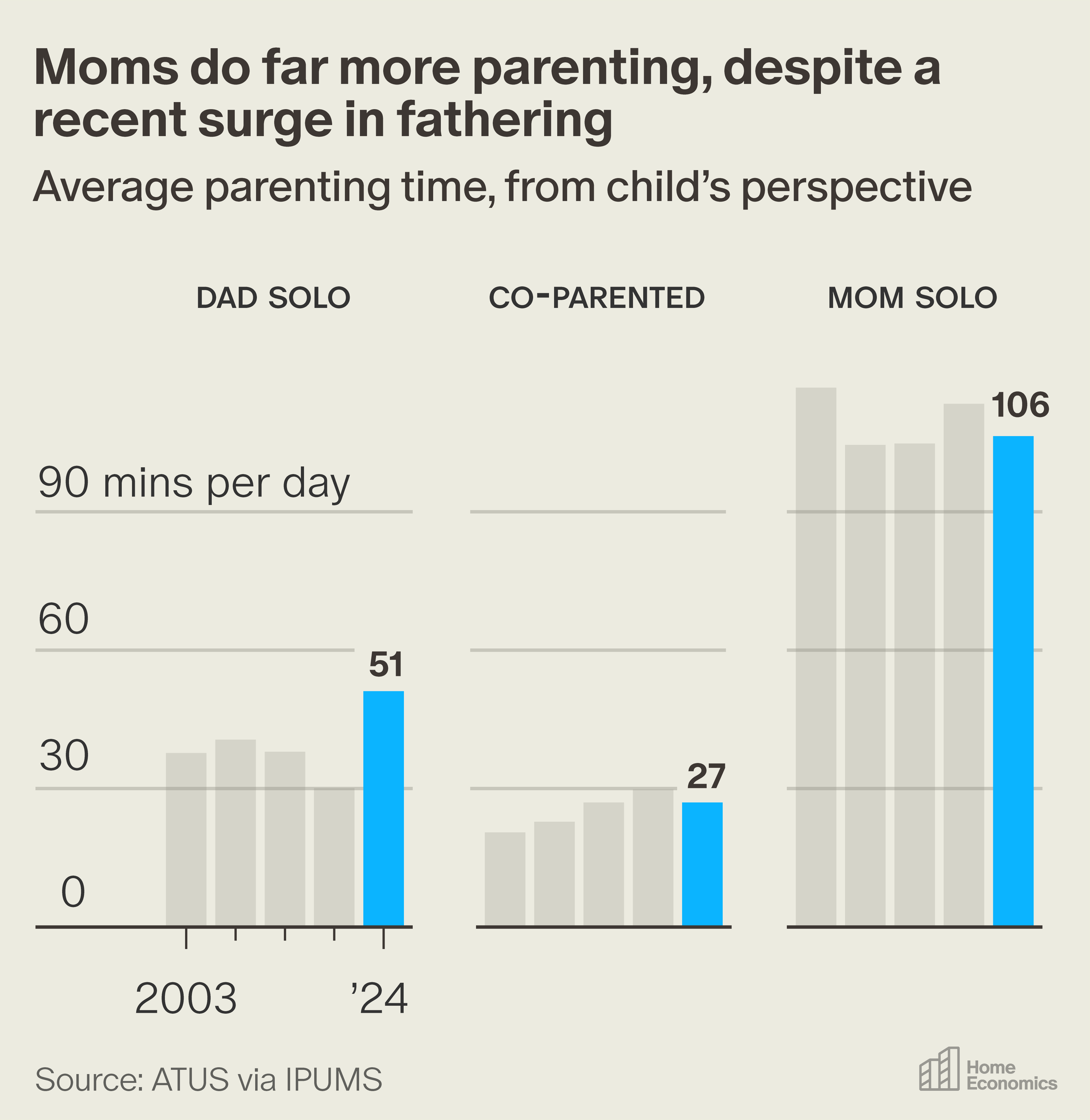 Despite the large increase in dads’ childcare time, there is no question that mothers still spend much more time raising children. This is especially true when we look at solo parenting. According to the American Time Use Survey, mothers’ solo childcare time is still twice that of fathers.