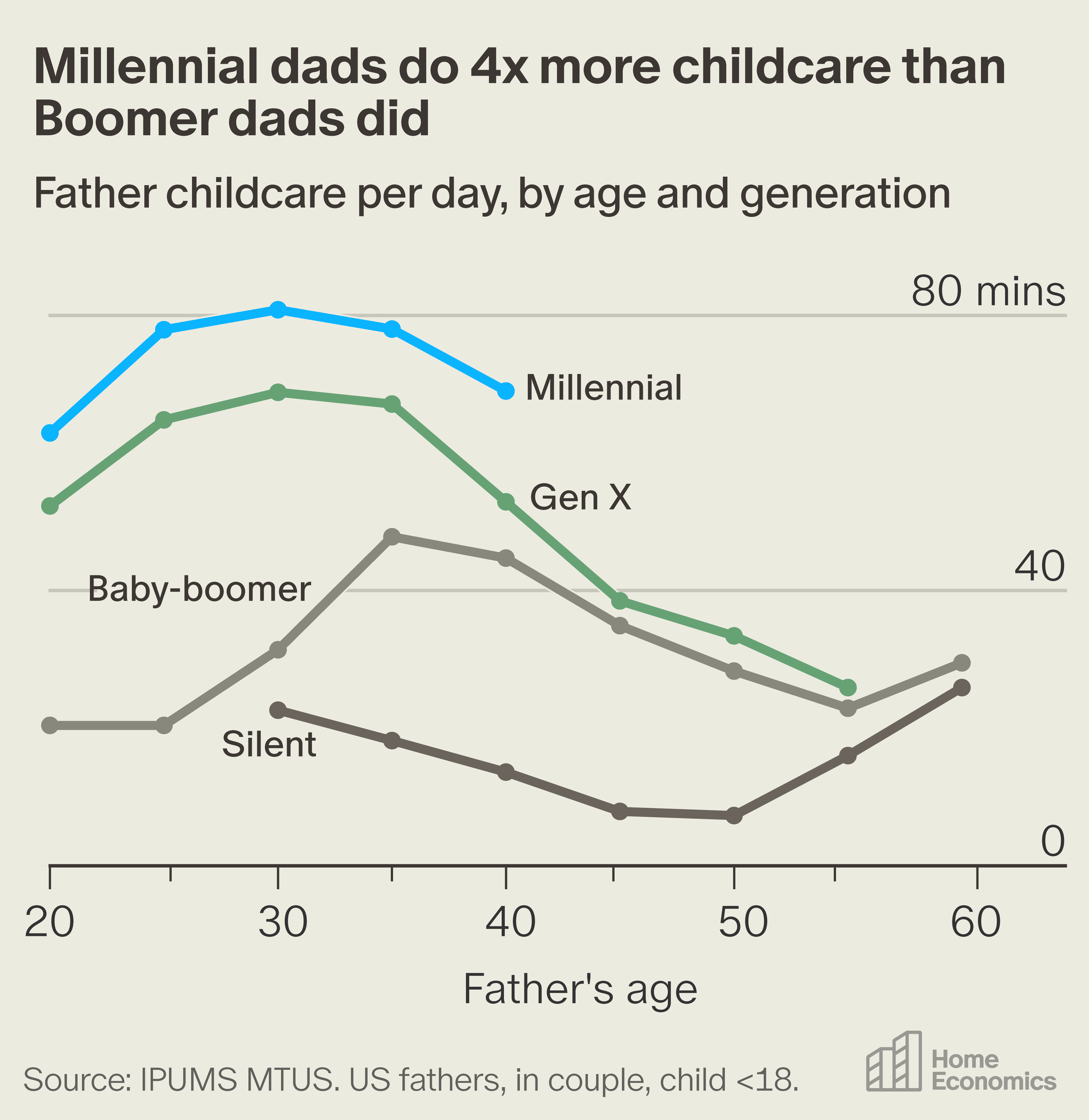 American fatherhood has transformed in the last few generations. Compared to their Boomer parents, childcare time among Millennial dads has more than doubled. Compared to their Silent Generation grandparents, it’s nearly quadrupled. You will be hard-pressed to find any part of day-to-day modern life that has changed more in the last half-century than the way today’s parents—and fathers, in particular—spend their time.