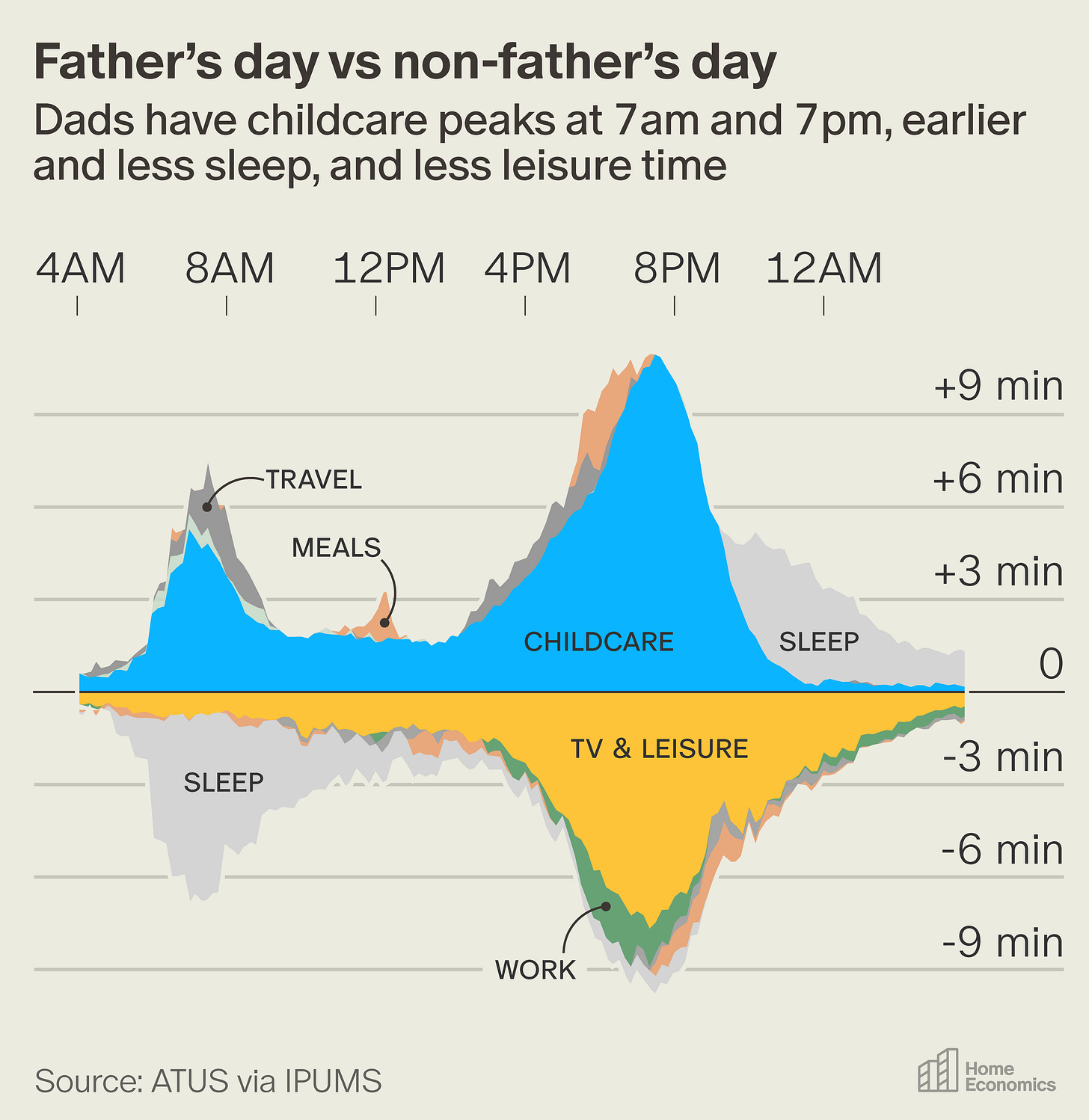 American guys watch a lot of television. When you become a dad, it’s very hard to keep up with all the movies, TV shows, and sports that you followed before you had kids. The rise of childcare time most directly seems to replace TV and similar forms of leisure. What’s more, becoming a dad seems to turn many late-night owls into early birds, as dads spend much more time sleeping between 9 p.m. and 3 a.m. to account for lost sleep in the early morning.