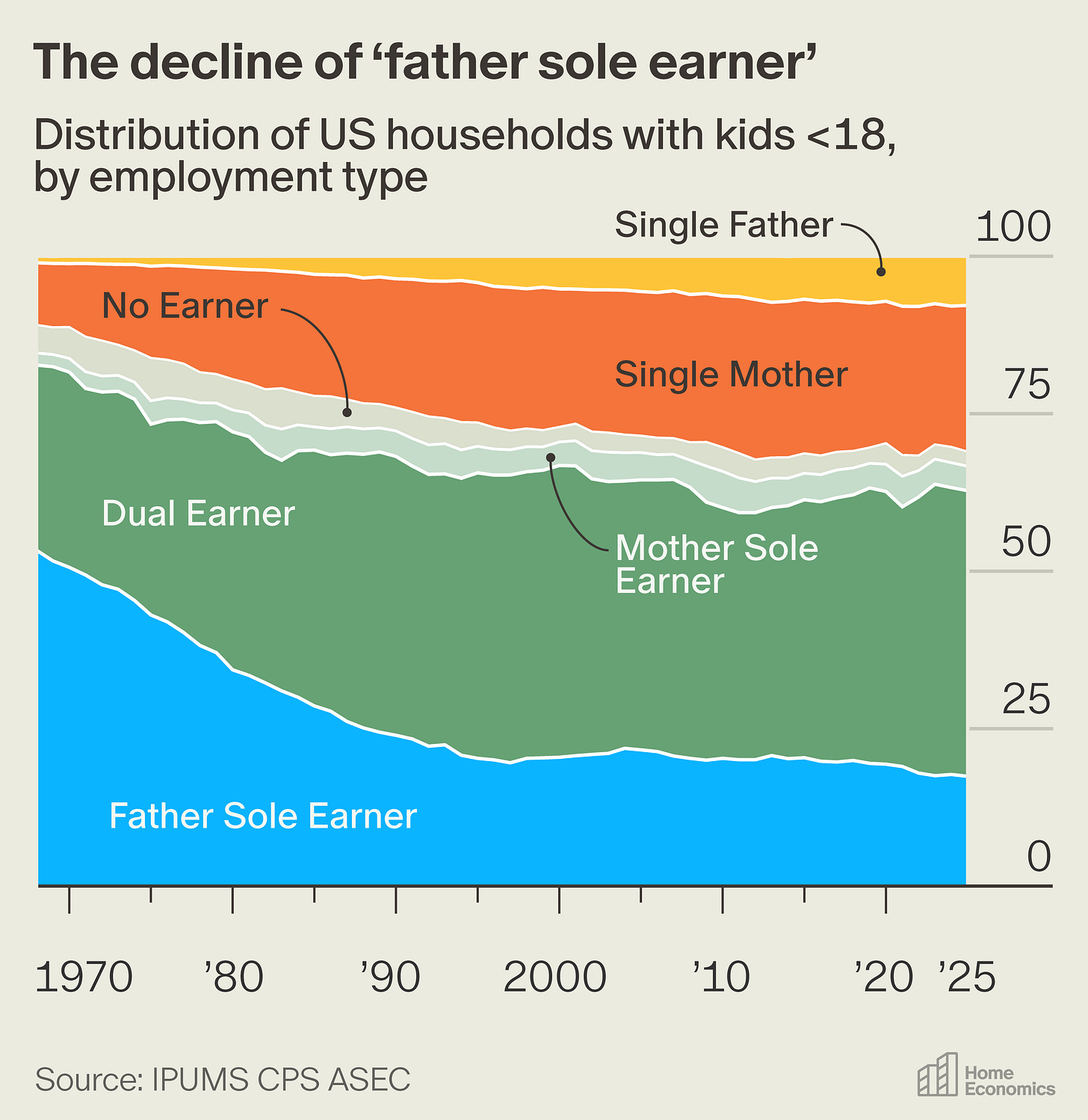 Since the 1960s, the female labor force participation rate has risen, which meant fewer moms stayed at home to take care of the kids. As households moved toward dual earners, someone had to cover the remaining childcare— and that someone, in most households, turned out to be the dad.