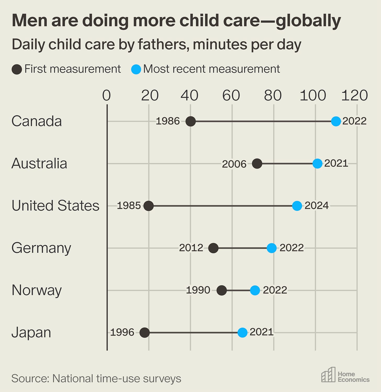 The working-husband-and-housewife norm is not a biological inscription in our genes. It is an invention of the Industrial Revolution. And it is disappearing around the world. In addition to the U.S., fathers’ childcare time is surging in Canada, across Europe, and in other rich countries, such as Japan.