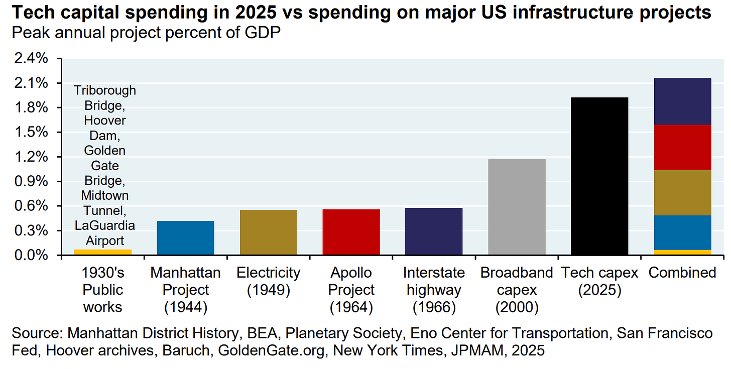 What you’re seeing in the remarkable chart above is that private sector spending on AI in 2026 is forecast to exceed $700 billion, which is not a number that is easy to think about. As a share of GDP, companies are currently devoting more resources to AI than the combined peak annual capital spending on key 1930s public works projects and the Manhattan Project and the 1940s electricity boom and the Apollo Project and Interstate highway construction. It’s important to note that AI spending is overwhelmingly financed by the private sector, whereas most of those infrastructure projects were financed by the largesse of the federal government. Once again, nothing like this has ever happened before, and if you feel extremely confident about how this is going to turn out, I think you might be crazy.